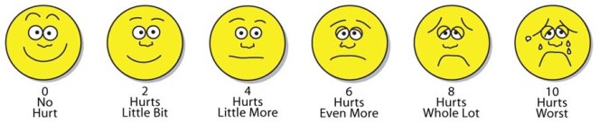 Wong-Baker: Represented by faces with expressions, this scale follows the same guideline as the numerical scale. 0 is represented by a smiley face, while 10 is represented as a distraught, crying face. This scale is useful when rating pain in children, or for adults with mild cognitive impairments.